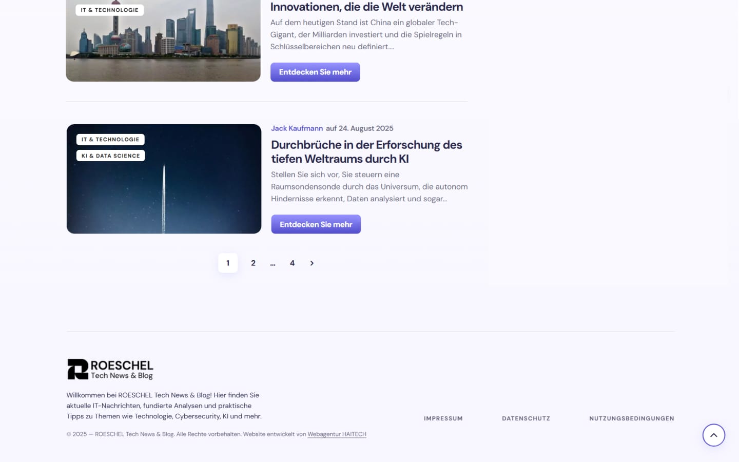 Kategorien-Übersicht für verschiedene IT-Themen (KI & Data Science, Cybersecurity, FinTech, EdTech, Business Transformation); Blog mit Beiträgen, Vorschaubildern, Schlagworten und Datum; Suchfunktion, Kategorien-Filter, Kommentarbereich; DSGVO-Konformität und SSL-Verschlüsselung; Newsletter-Anmeldung, Social-Sharing, Integration von Google Analytics; schnelle Ladezeiten, barrierefreies Design nach WCAG-Standards.